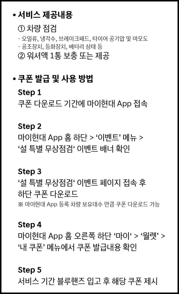 현대자동차 무상점검 쿠폰을 2월 2일부터 받으세요. 설 귀성길 타이어, 브레이크, 배터리 점검부터 블루기본점검 8년 8회 혜택까지 총정리했습니다.