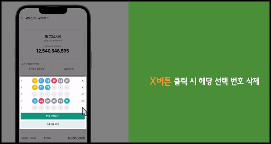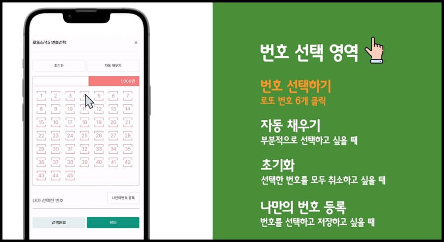 또한 온라인 화면에서도 PC와 동일하게 다양한 번호 선택 방식을 지원합니다. 6개 번호를 직접 선택하는 수동방식, 시스템에 맡기는 자동방식 그리고 일부만 선택하는 반자동 방식이 모두 가능하게끔 화면 터치가 간편하게 구성되어 있고, 나만의 번호 기능을 통해 자주 쓰는 번호를 저장해둘 수도 있습니다.