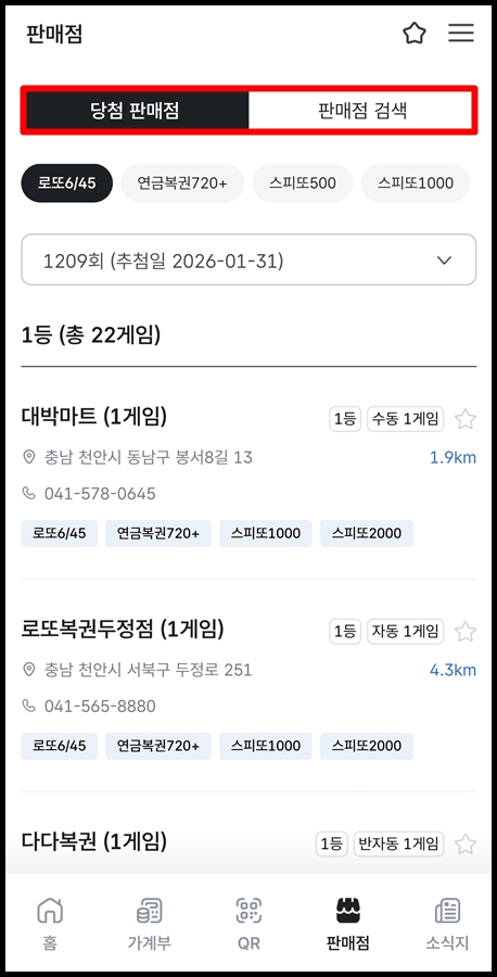 또, 당첨된 판매점들을 리스트로 보여주고 있으며 내가 처음에 설정한 관심 지역의 판매점 위치와 연락처를 실시간으로 확인할 수 있습니다.