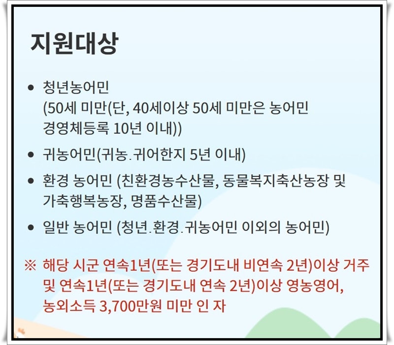 혜택을 받기 위한 주요 대상은 만 50세 미만의 청년 농어민과 귀농 5년 이내의 귀농어민 그리고 친환경 농어민과 일반 농어민으로 구분됩니다. 경기도 내 연속 1년 또는 비연속 2년 이상 거주 및 영농 활동을 유지해야 신청 자격이 주어집니다. 또한 농외소득이 3700만 원 미만이어야 경기도농어민기회소득통합지원시스템 심사를 무사히 통과할 수 있습니다.