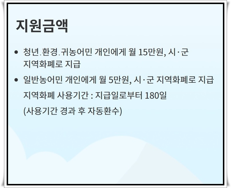 만 50세 미만의 자격을 갖춘 청년 농어민은 개인당 매월 15만 원을 시군 지역화폐 형태로 정기적으로 지급받습니다.